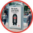 Smartstreets have created a range of localized promotional tools including eye catching post pointers and brightly coloured, non-slip pavement graphics to draw attention to the problem of gum and cigarette litter. These promotional tools positively encourage the considerate disposal of chewed gum and cigarette butts in the Buttcatchers. They can be used long term or just for an initial 'awareness boost' and then removed for a more discreet look to the gum and cigarette bins.
